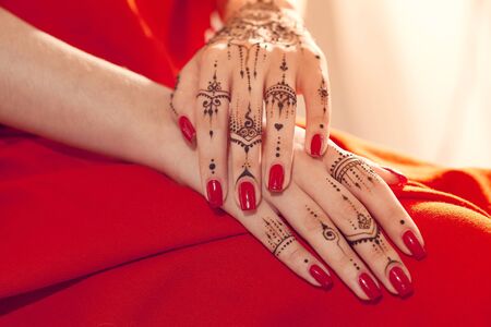 Woman Hands with black mehndi tattoo. Hands of Indian bride girl with black henna tattoos. Fashion. India