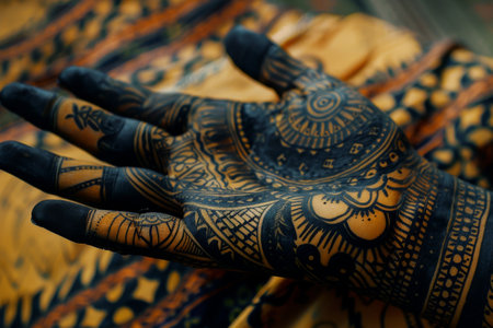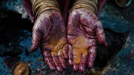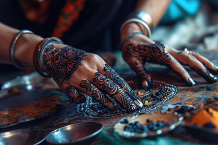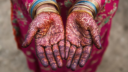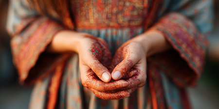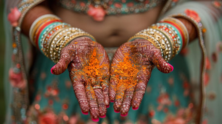 A vibrant portrayal of hands adorned with intricate henna designs and ritual powder, capturing the essence of cultural beauty and celebration in an outdoor setting.