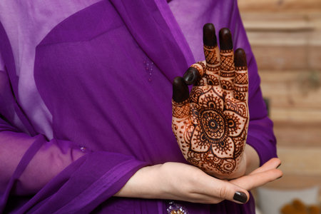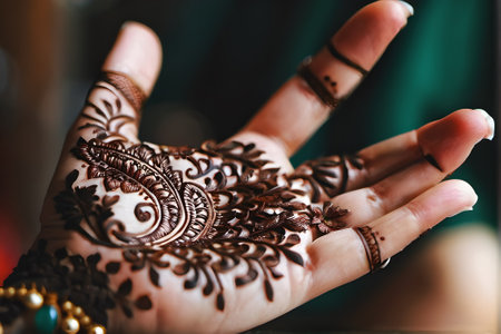 Close up view of a woman's hands adorned with intricate henna tattoos, capturing the beauty of tradition during an Indian wedding ceremony