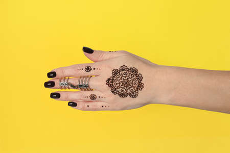 Woman with henna tattoo on hand against yellow background, closeup. Traditional mehndi ornament