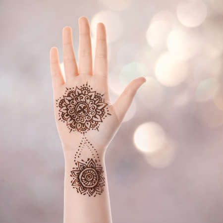 Woman with henna tattoo on hand against blurred lights, bokeh effect