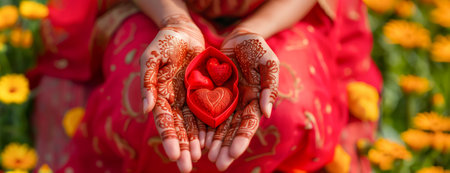 Banner Indian Asian Woman Holds Red Box with Sweets, Chocolate in Shape of Heart. St. Valentines Day or Wedding. Female Hand with Mehndi Tattoo. Flowers, Love, February, 14 AI Generated Horizontal.