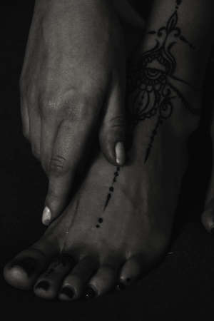 Close-up of female legs and hands with henna tattoo on the feet. Black and white photo. Gently feminine graceful decoration, respect for a woman, love and take care of yourself.