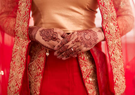 Two elegantly decorated hands, adorned with intricate henna patterns, are presented against a soft, neutral background. The rich brown tones of the henna contrast beautifully with the vibrant red and gold attire, symbolizing celebration and cultural heritage.