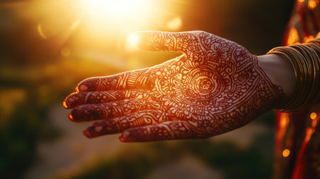 Intricate mehndi designs drawn on a hand, glowing under the sun.
