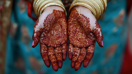henna designs on a brides hands at indian weddings represent love and happiness, showcasing intricate and colorful patterns