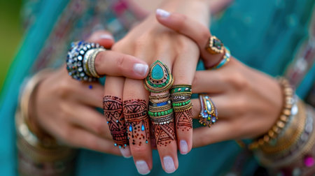 A close-up view showcasing beautifully adorned hands featuring detailed henna designs and gleaming jewelry, capturing the essence of cultural elegance in traditional attire.