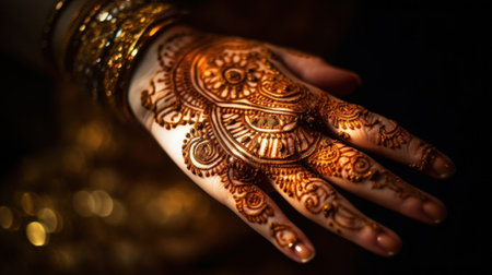 Ornate henna tattoo decorates bride hand with gold . the art of beautifying the body. generated by AI.