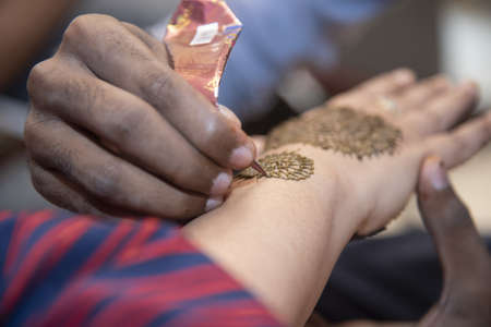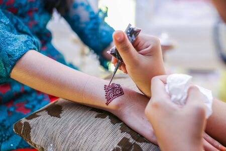 Artist applying henna tattoo on women hands. Mehndi is traditional Indian decorative art, Hand with floral mehendi. Beauty drawing for weddings and festivals using paste from powdered dry plant