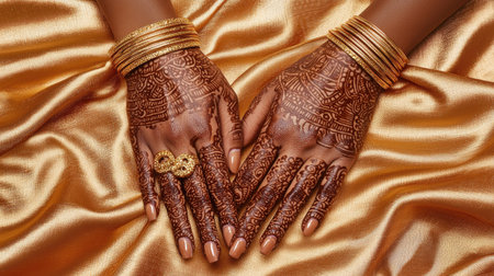 Stunning close-up of beautifully decorated hands adorned with intricate henna patterns, complemented by elegant gold accessories against a luxurious satin backdrop.