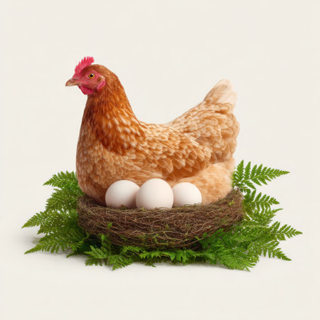 A serene scene featuring a hen nestled in a lush nest with fresh eggs, surrounded by vibrant green ferns, embodying natural beauty and farm life.