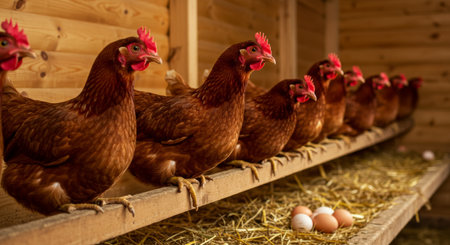 Brown hens in a wooden chicken coop lay eggs in straw nests. Agriculture concept.