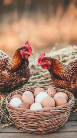 Two brown hens standing by a wicker basket full of fresh organic free range eggs in a chicken coop, representing local farming, sustainable agriculture, and healthy food production