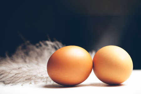 Pair of domestic eggs healthy protein food and beautiful light feather on black and white background closeup