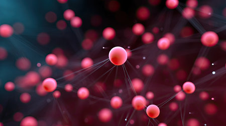 This abstract image illustrates vibrant red particles connected by fine lines, symbolizing scientific concepts in a modern and dynamic composition against a dark backdrop.