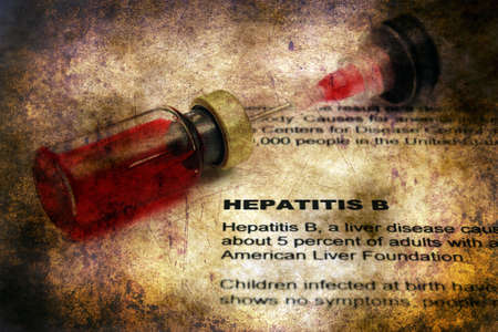 hepatitis B - diagnosis written on a white piece of paper. Syringe and vaccine with drugs