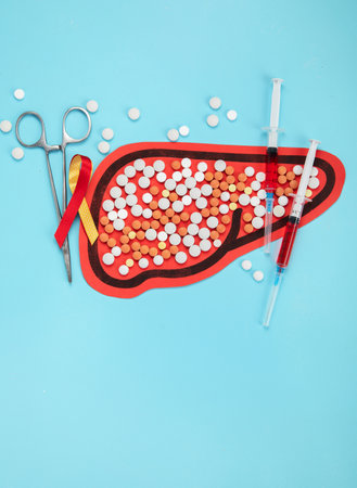 A liver model made of colorful materials shows various pill representations symbolizing treatment for liver diseases.