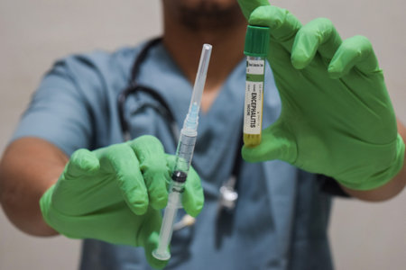 Text Encephalitis vaccine of is written on a bottle with background of a doctor with a syringe in a medical glove mask. Medical concept