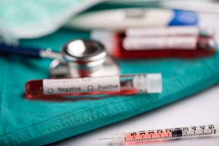 Fictional Blood samples with infected Hepatitis C virus, with stethoscope, mask and syringe and other stuff.