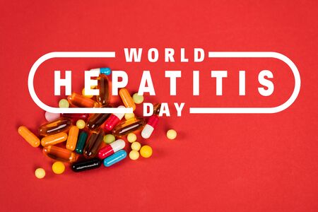 World Hepatitis Day symbol. Concept words World Hepatitis Day on yellow note. Beautiful deep blue background with pills. Healthcare and World Hepatitis Day concept. Copy space.