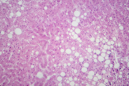Light micrograph revealing liver tissue with fatty infiltration, indicative of hepatic steatosis or fatty liver disease.