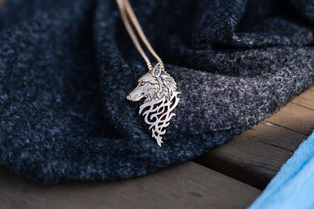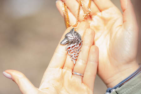 Pendant wolf head necklace black color shoot outside in a sunny day closeup. Selective Focus