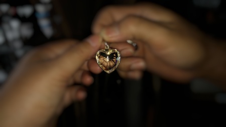 Clear heart shape pendant in male and female hands . Dark image tone