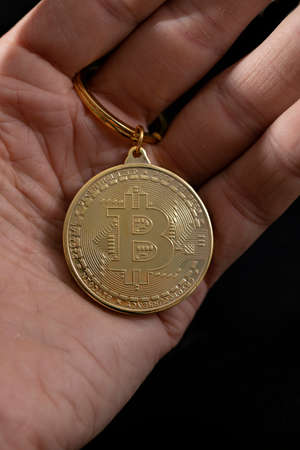 Bitcoin keychain in man hand on black background, close up.