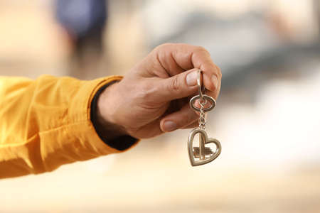 Man holding key on chain outdoors