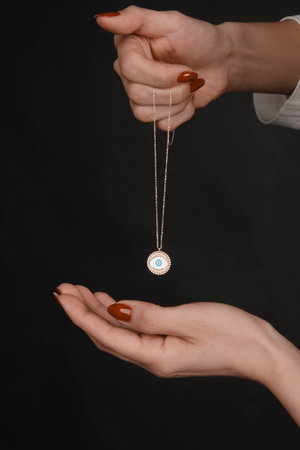 man hand hold necklace traditional wood background