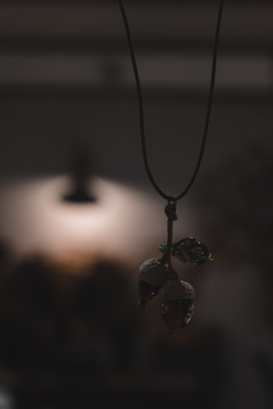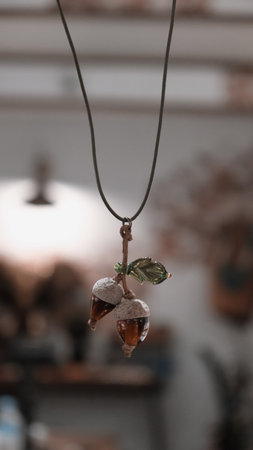 Yin Yang pendant necklace brown color handmade shoot outside in a sunny day closeup. Selective Focus