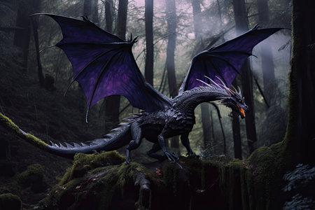 majestic purple dragon flying through dark forest, created with generative ai