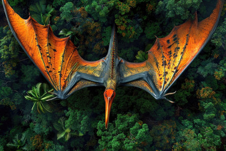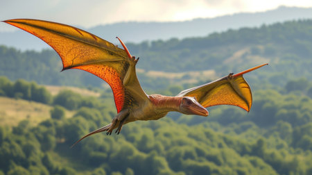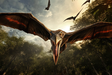 Pterodactyl - prehistoric era wing dinosaur flying at forest