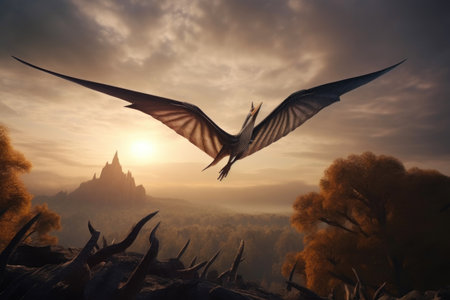 View of a giant pterodactyl above the trees in an ancient environment. Ancient creatures in their natural habitat. Prehistoric natural landscape with pterodactyl