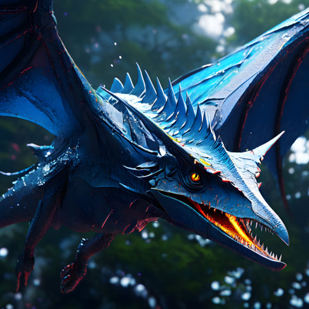 Closeup of a dragon's face with glowing blue eyes