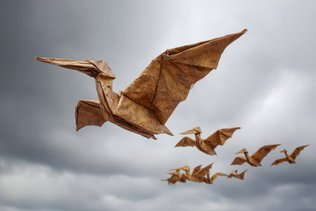 Delicate origami pterodactyls in earthy tones soar across a somber, cloud-laden sky, their gentle shadows highlighted by muted, diffused daylight.