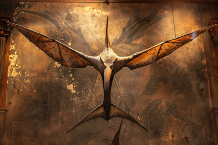 A model of a Pterodactyl, an ancient flying reptile, hangs from the ceiling of what appears to be a museum or exhibit.