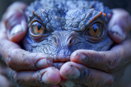 Close up of a Realistic Blue Creature Figurine with Orange Eyes Held in Hands with Textured Skin AI Generative