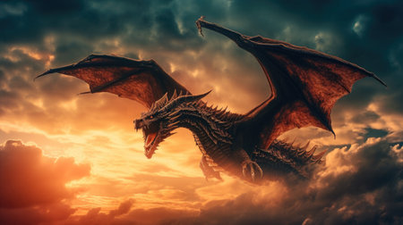 Dragon flying in cloudy sky at dawn. Dragon. Generative Ai