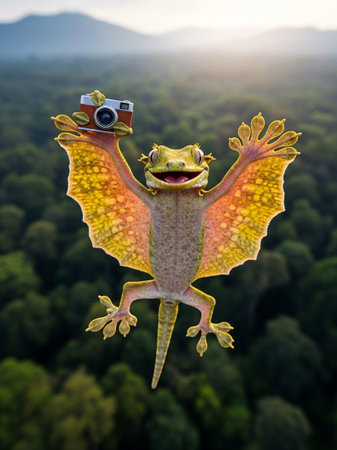 A colorful lizard with wings holds a camera in a forest landscape