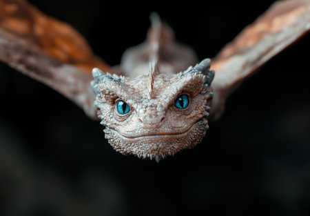 Close-up of a scaly dragon-like creature with piercing blue eyes