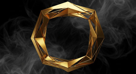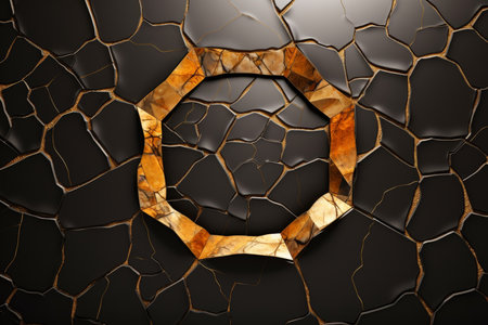 A gold-colored, geometric octagon shape rests on a textured, dark gray surface. The composition features contrasting textures and colors, with the shape positioned at an angle. The image suggests an abstract design suitable for various creative or commercial projects, providing negative space for content.