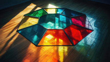 This striking image features a geometric arrangement of stained glass pieces that cast colorful reflections on a polished wooden floor, creating a vibrant and artistic atmosphere.