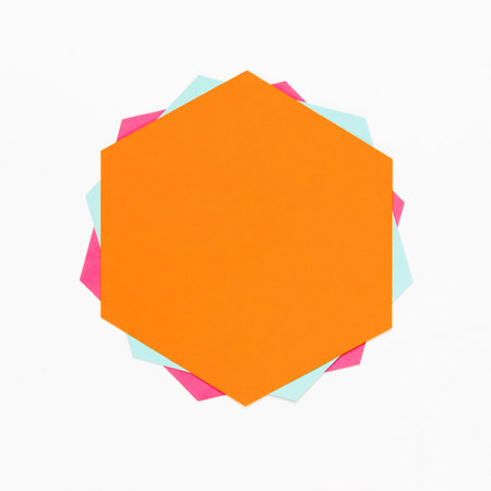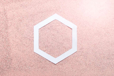 Geometric simple composition with white paper hexagon cut out outline on pink blue background.