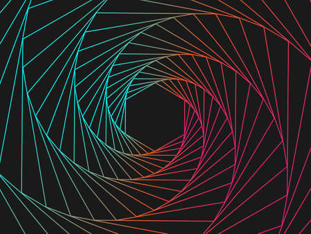 An abstract, colorful geometric tunnel formed by a rainbow-colored wireframe structure creates a mesmerizing vortex effect against a dark background.