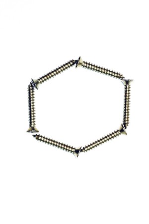 An abstract geometric fractal shape composed of interlocking hexagons and triangles with a metallic, reflective texture against a clean white background.