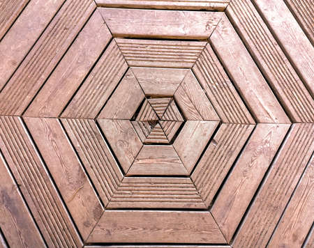 A wooden floor with hexagonal shapes. The floor well worn from years of use.