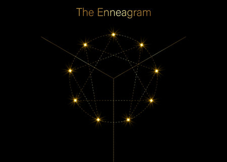 Enneagram icon, golden luxury sacred geometry, diagram logo template, one to nine concerning the nine types of personality, gold dashed line style vector illustration isolated on black background