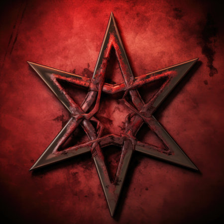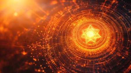 A detailed image of a geometric star symbol with a glowing circle in the center, set against an abstract background.