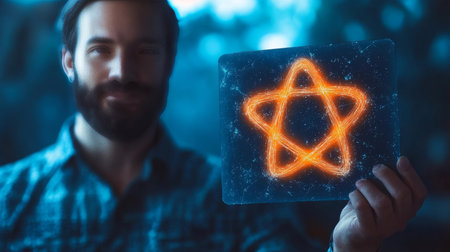Caucasian Man Holding Illuminated Star in Atomic Representation, Creating Enchanting Visuals